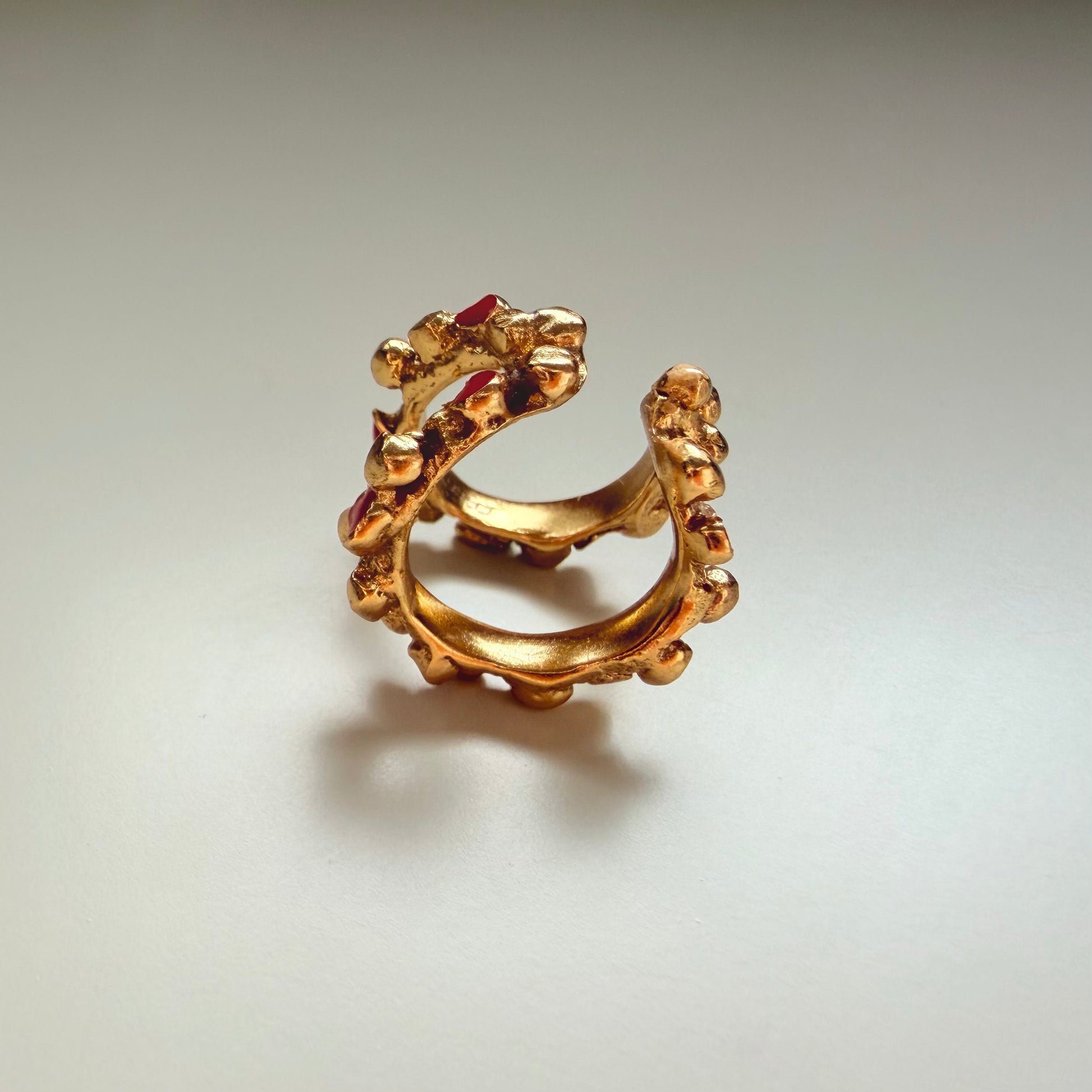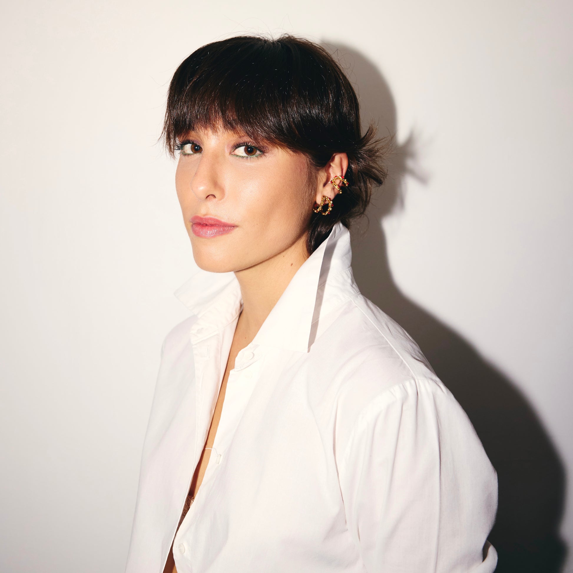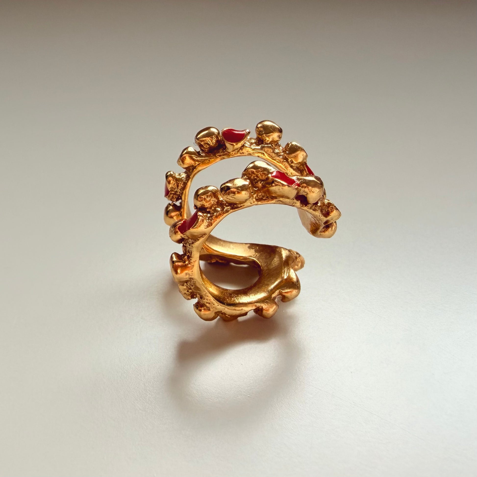 Earcuff doble realizado en latón bañado en oro de 24 quilates, con un delicado trabajo artesanal que resalta su diseño fluido.