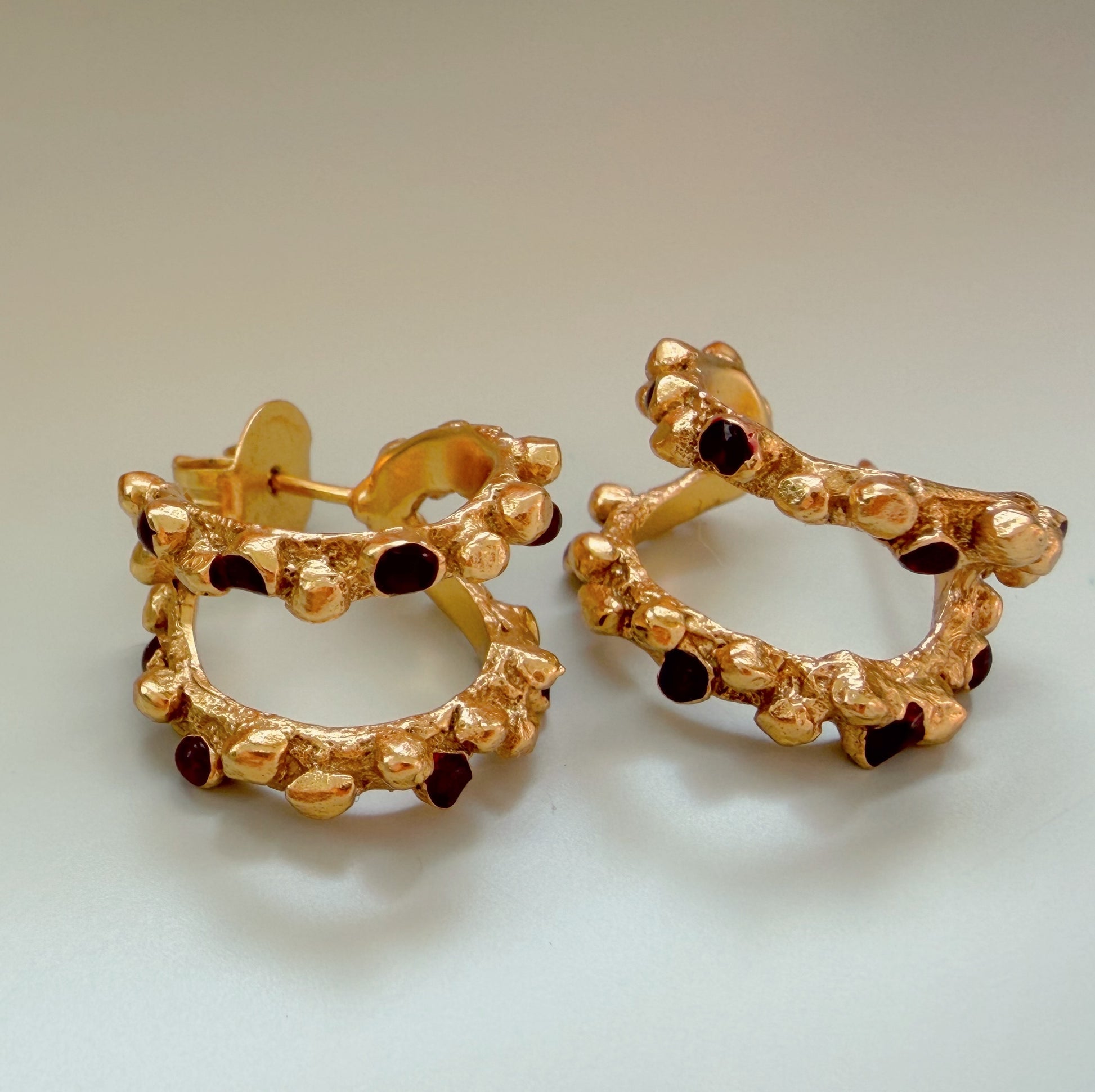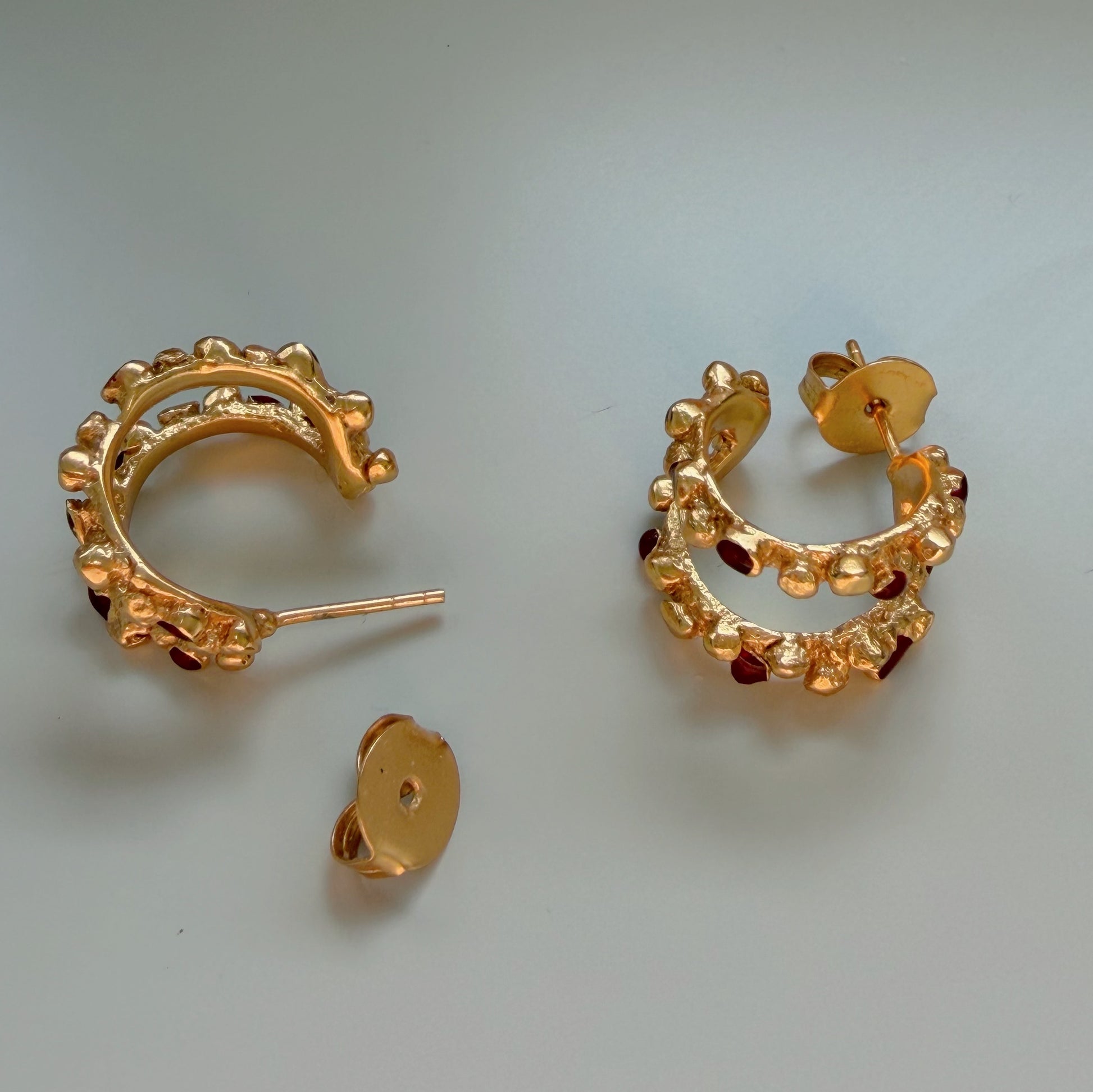 Aros pequeños dobles elaborados artesanalmente en latón bañado en oro de 24 kt, con delicados acentos burdeos aplicados a mano en zonas estratégicas.