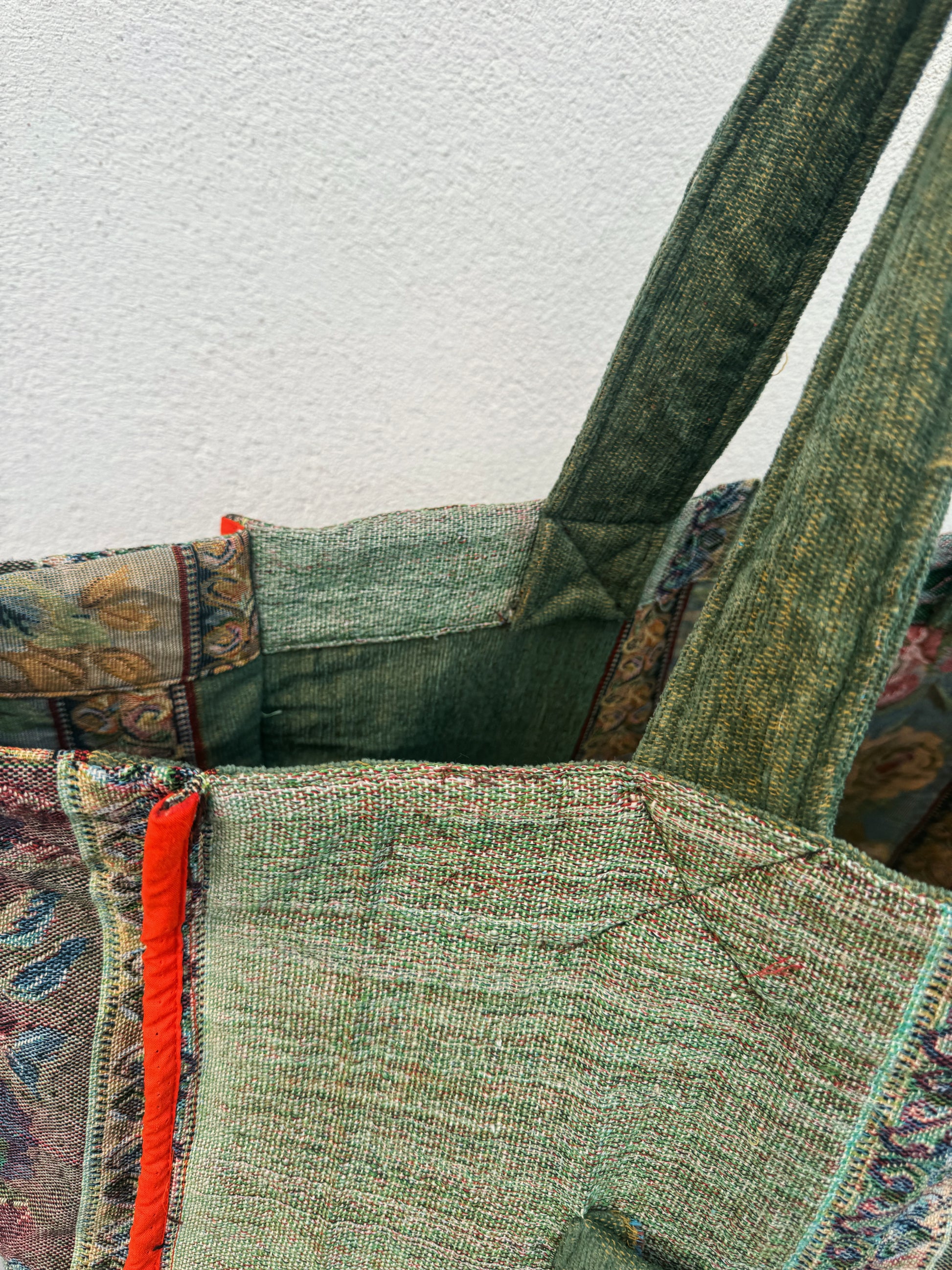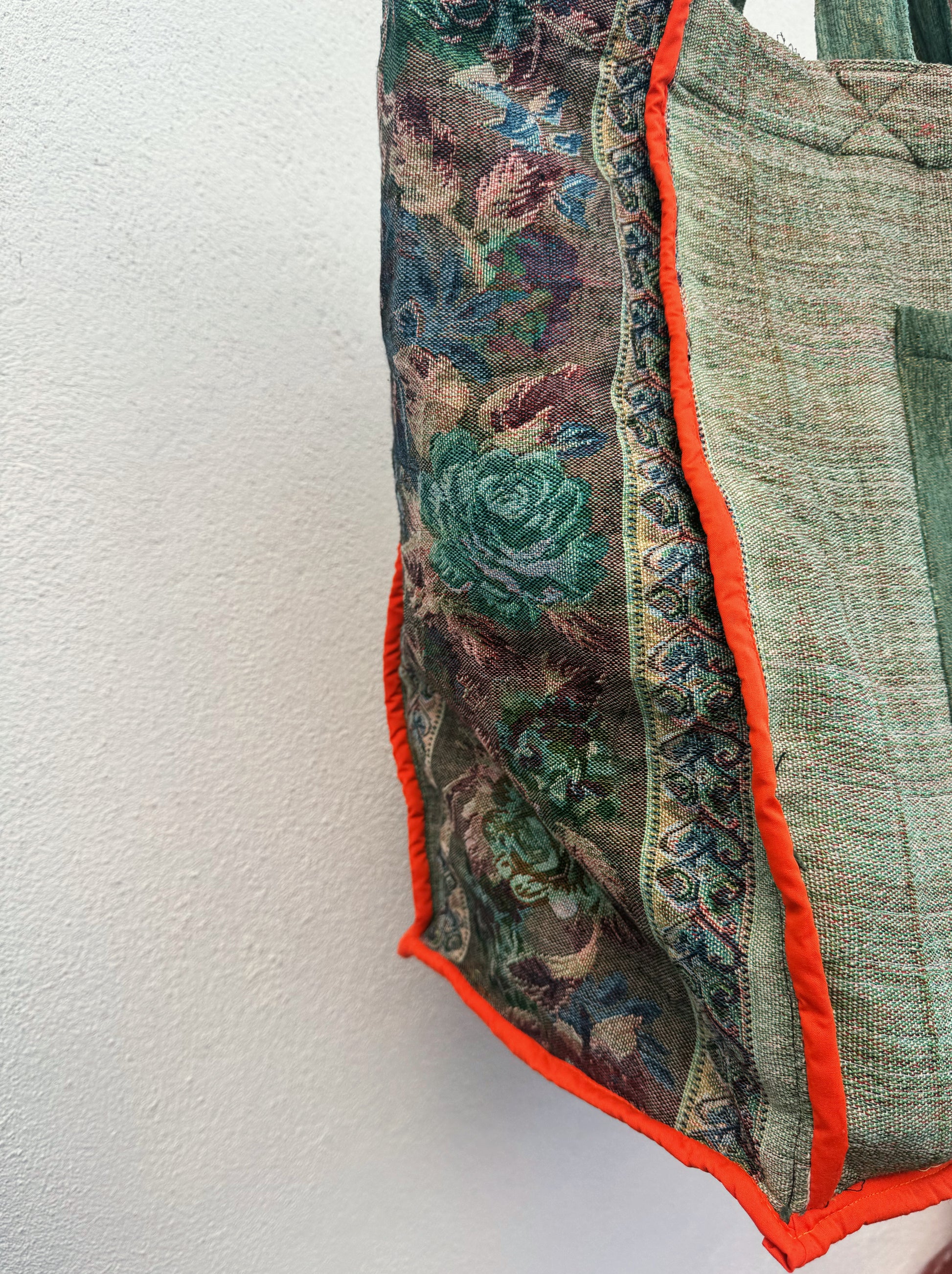 Cada bolso nace de cortinas antiguas rescatadas, piezas únicas que jamás se repetirán. Si existe uno, será el único; si hay dos, no habrá más. Así, cada uno es una pieza única, limitada e irrepetible.