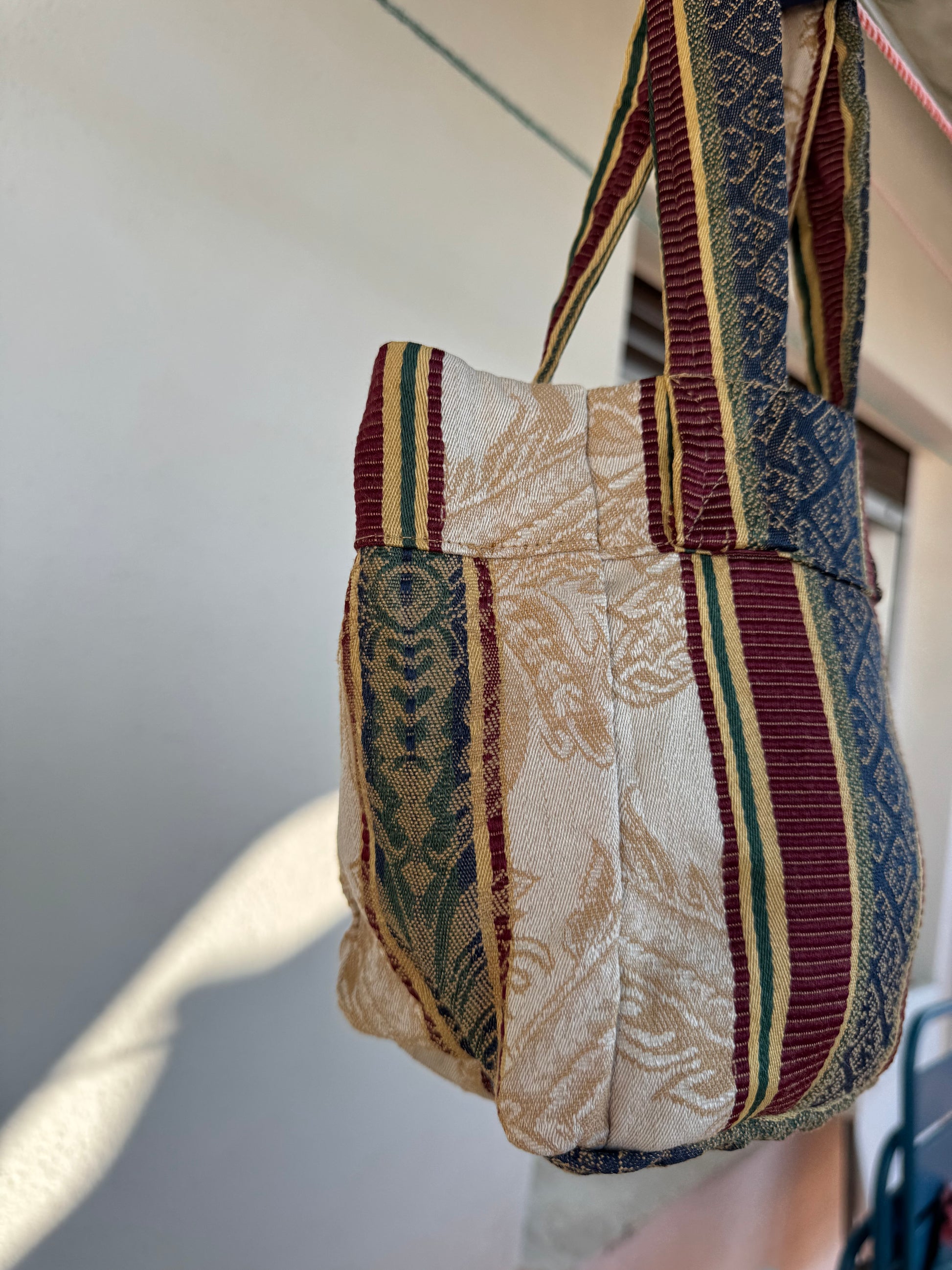 Cada bolso nace de cortinas antiguas rescatadas, piezas únicas que jamás se repetirán. Si existe uno, será el único; si hay dos, no habrá más. Así, cada uno es una pieza única, limitada e irrepetible.