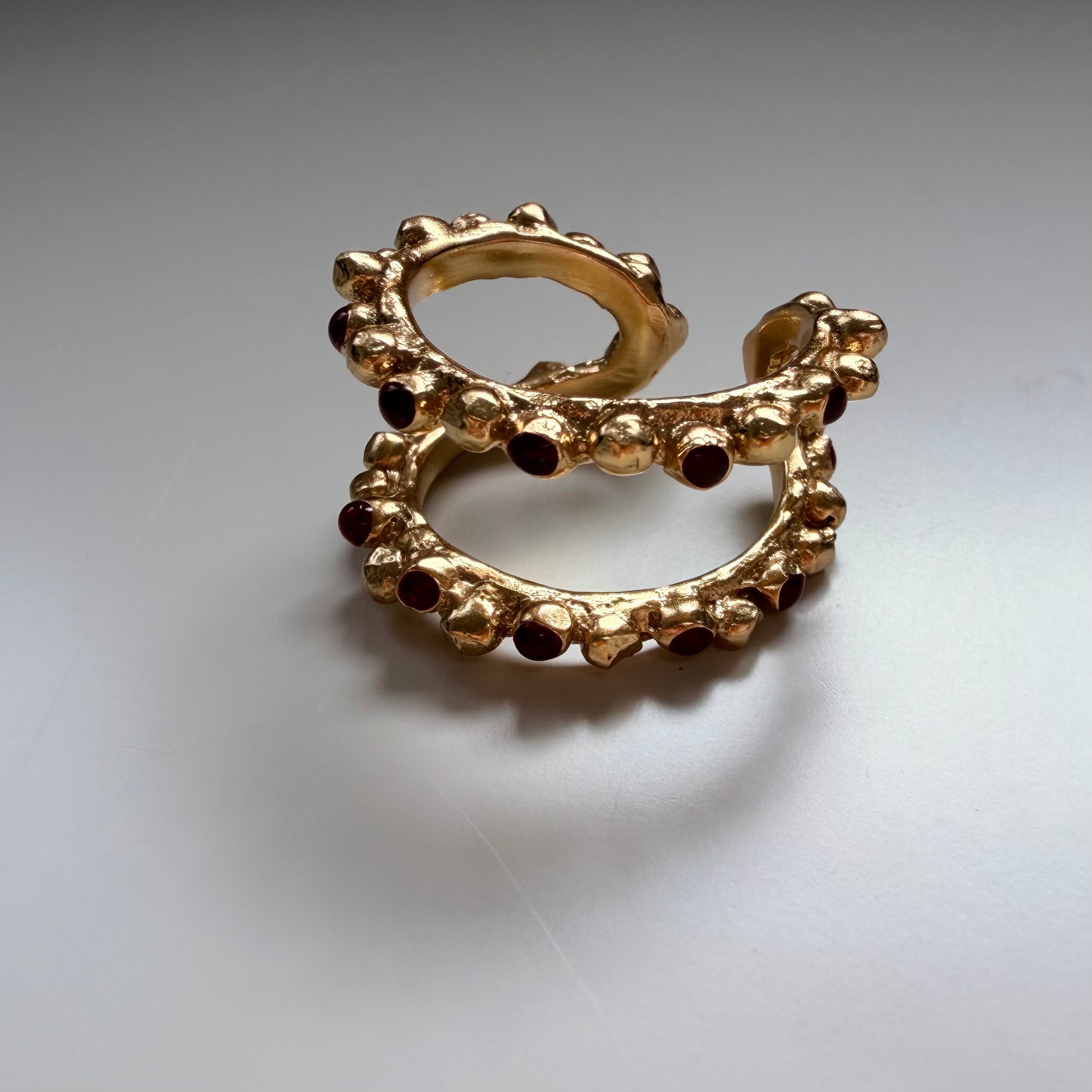 Anillo ajustable elaborado en latón bañado en oro de 24 quilates, con acabado artesanal.