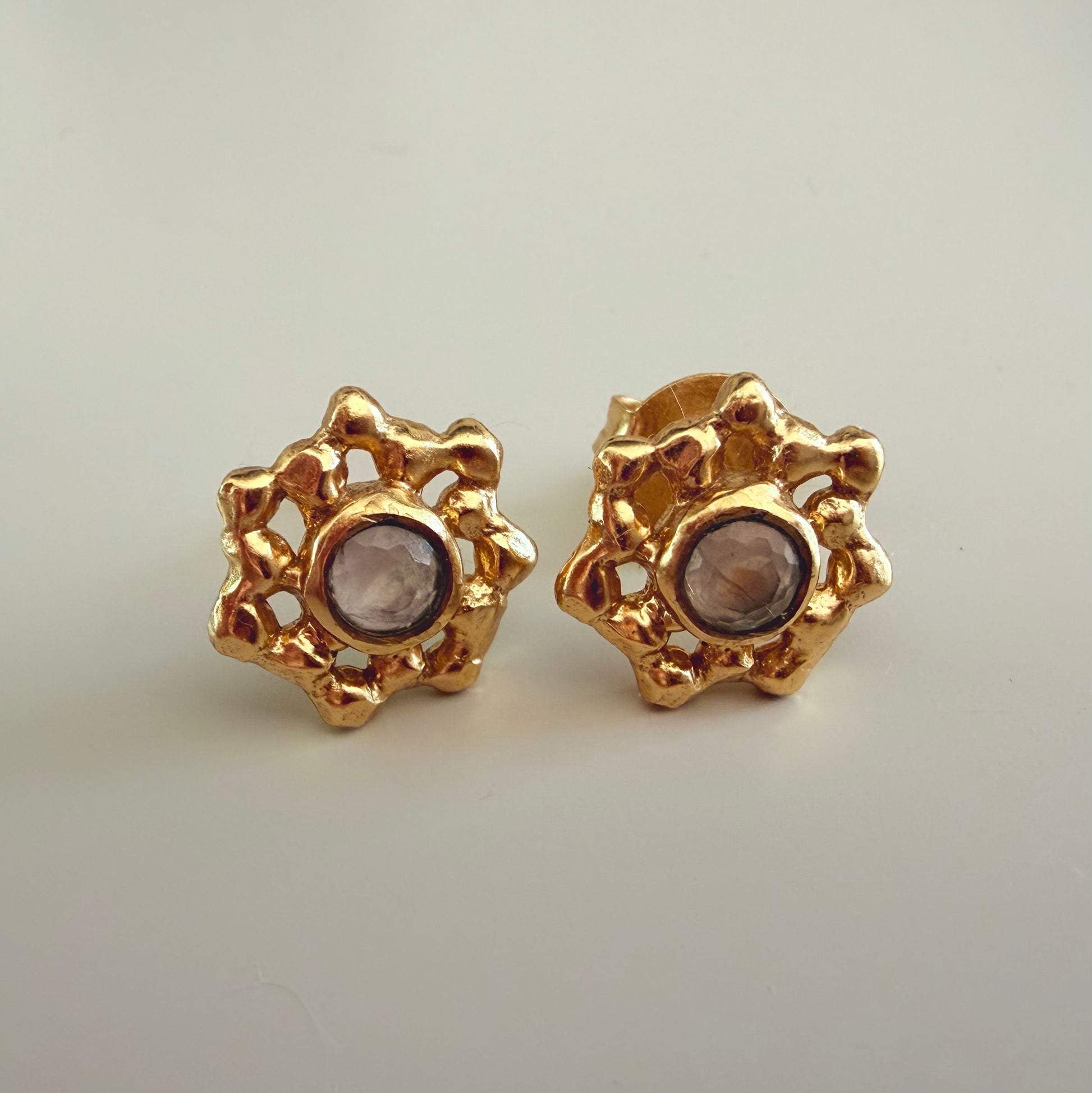 Pendientes mini elaborados artesanalmente en latón bañado en oro de 24 kt, con una piedra de cuarzo rosa en su centro.