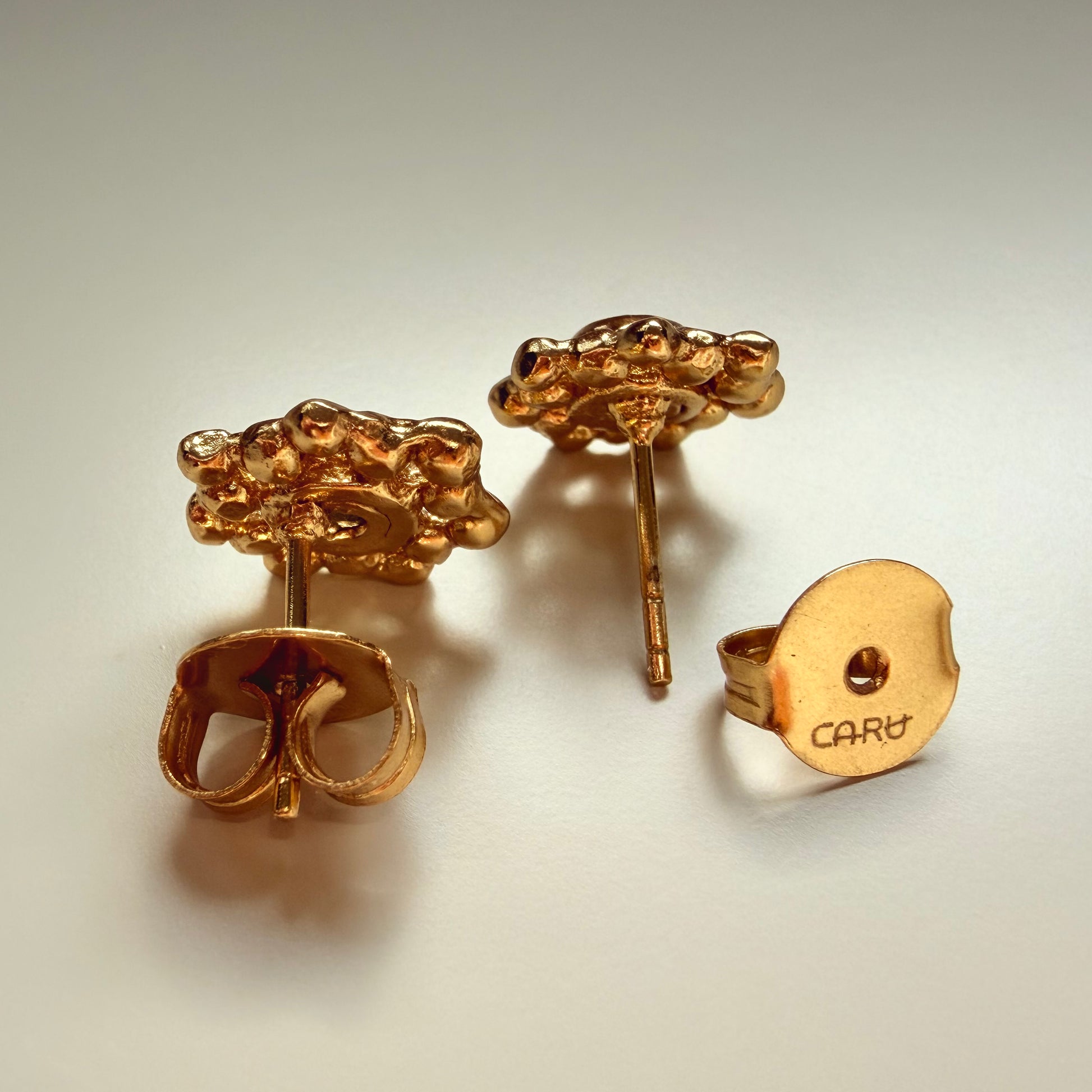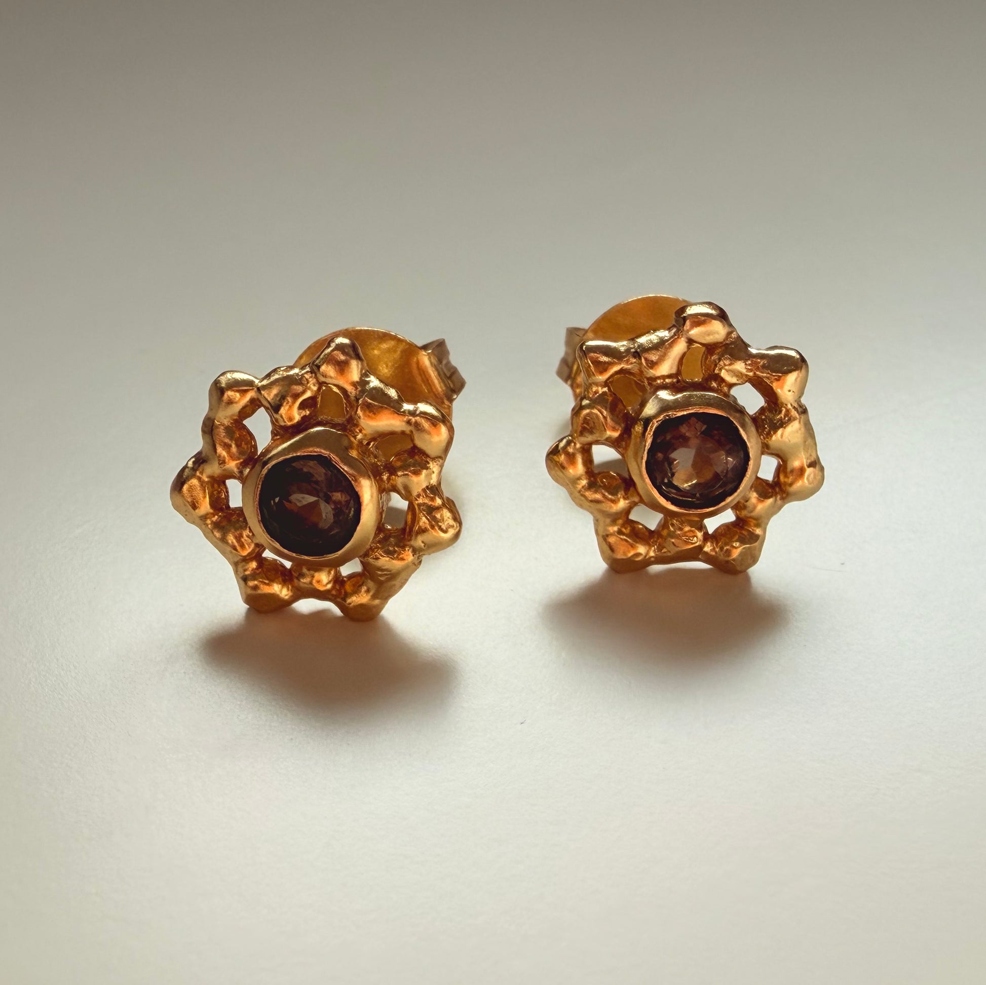 Pendientes mini elaborados artesanalmente en latón bañado en oro de 24 kt, con una piedra de topacio en su centro.